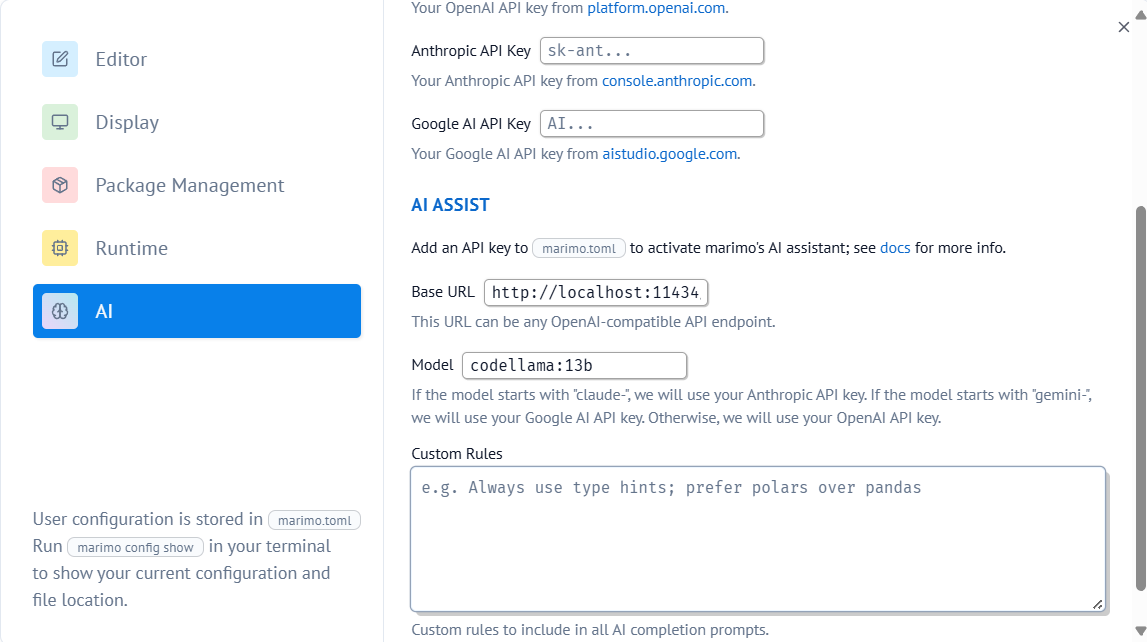 marimo also supports integrating with custom LLM providers for code completion suggestions. This allows you to use your own LLM service to provide in-line code suggestions based on internal providers or local models (e.g. Ollama). You may also use OpenAI, Anthropic, or Google AI by providing your own API keys.